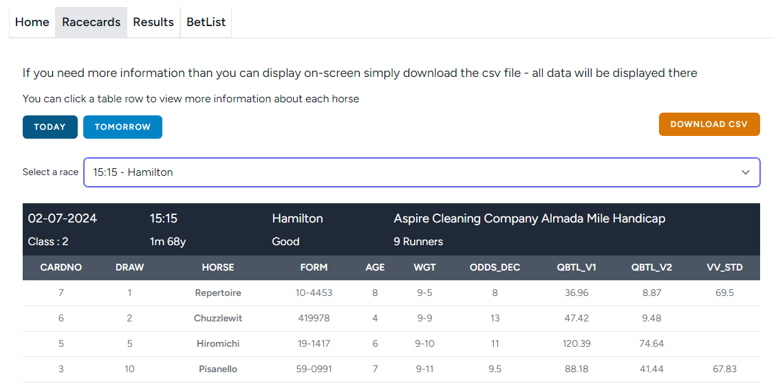 - Download daily racecards in spreadsheet format for today and tomorrow