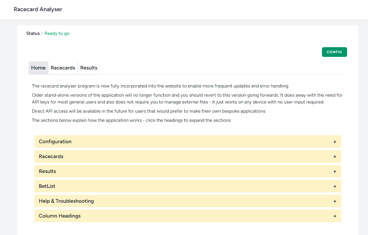 This product was initially distributed as a stand-alone application accessible remotely via API. However, I've now made improvements by incorporating the Racecard Analyser directly into the website